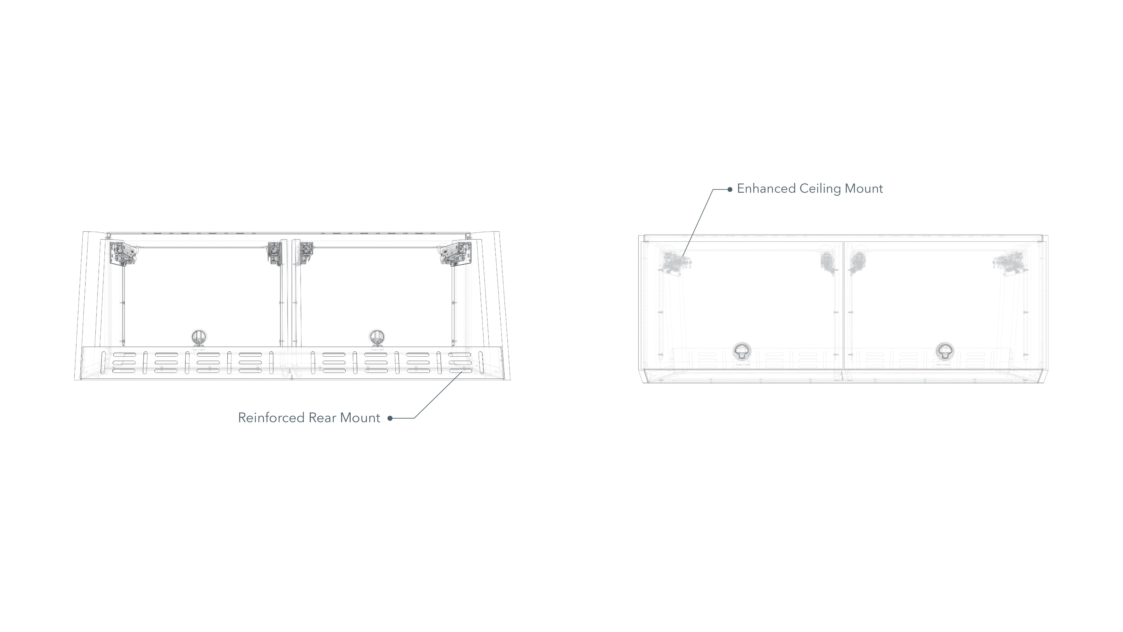 Ascent Cabinets offer flexible mounting options with holes for both wall and ceiling installation. Rivnuts or Plusnuts are recommended for secure mounting.