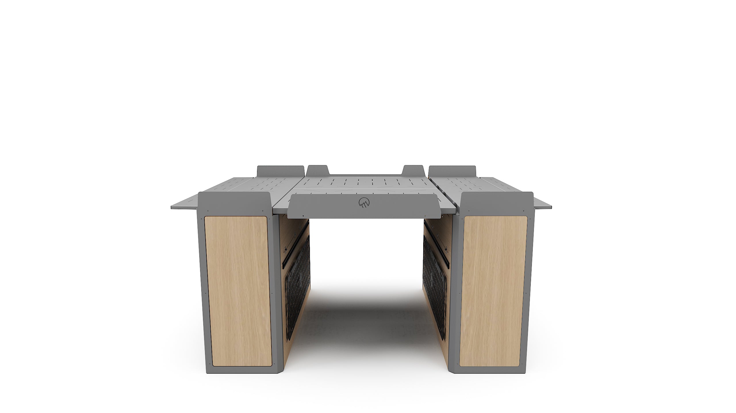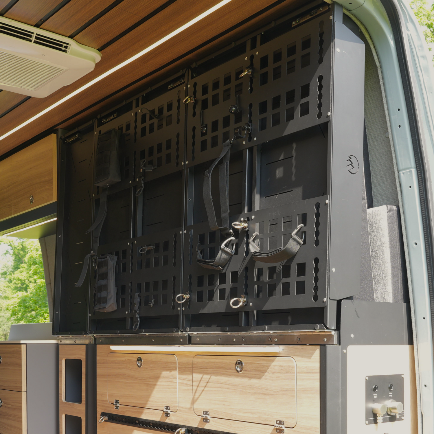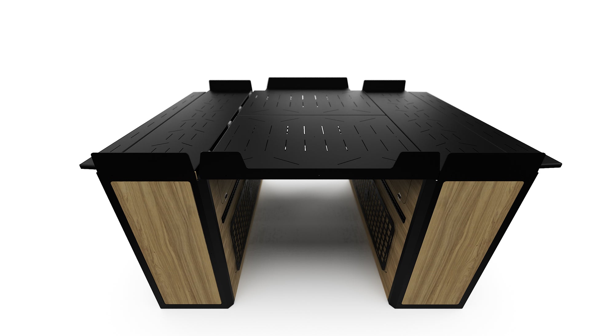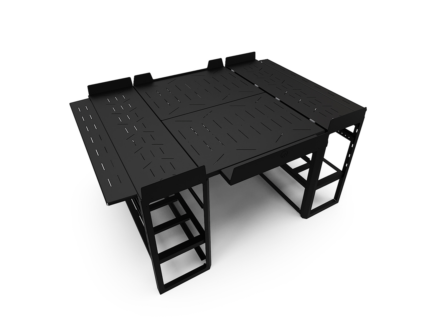 Lift-up bed platform engineered from laser-cut aluminum, providing a full-width storage zone for bikes, gear, and adventure equipment. Stows upright to free floor space and create a versatile workspace. Integrated L-tracks and MOLLE panel systems.