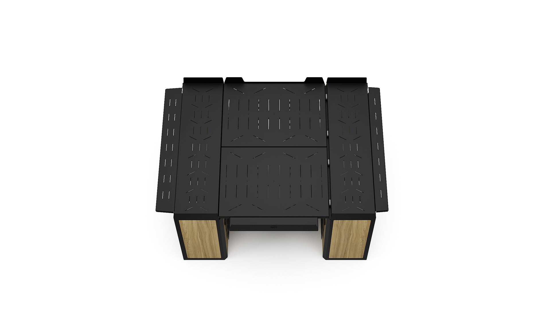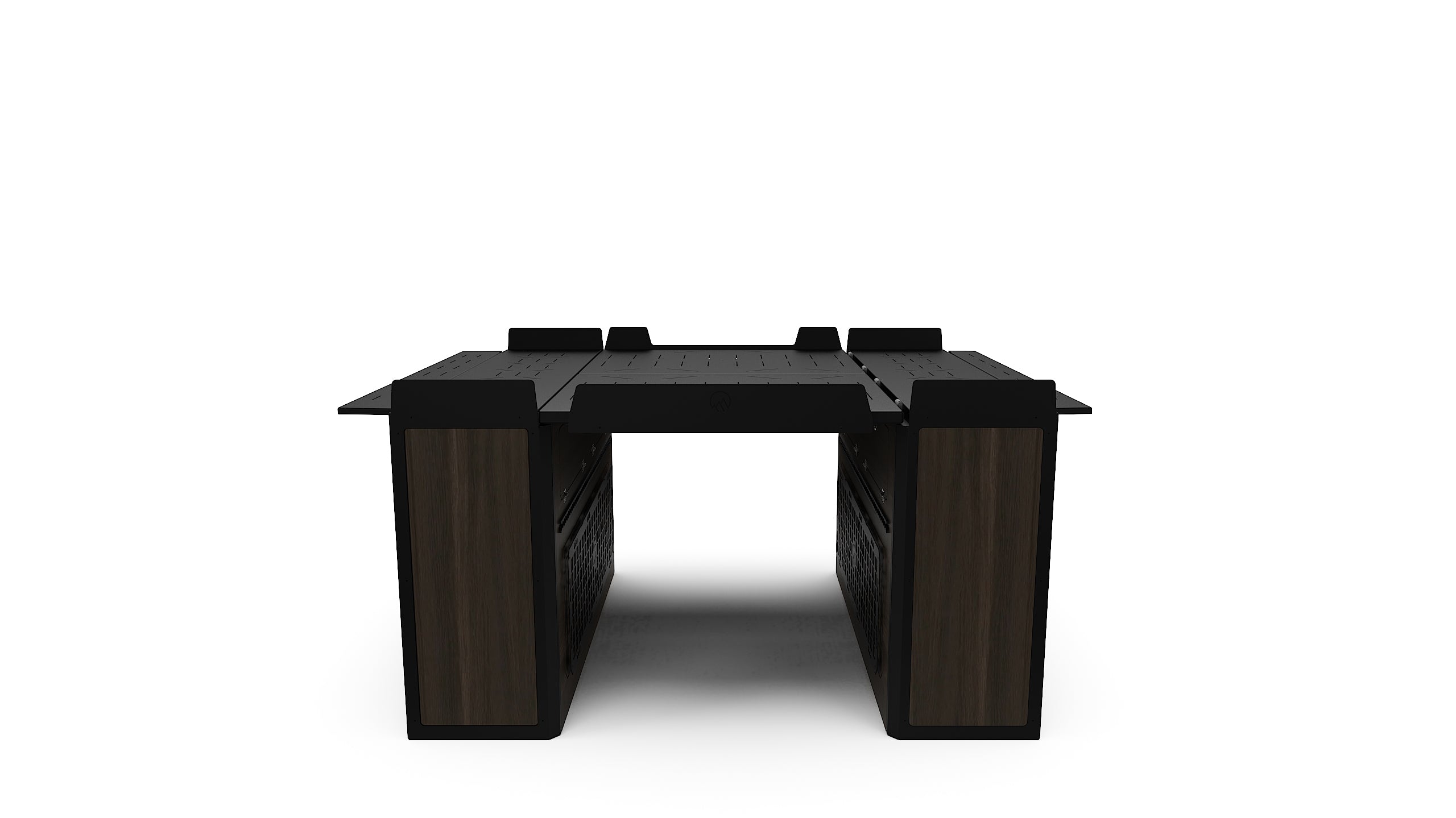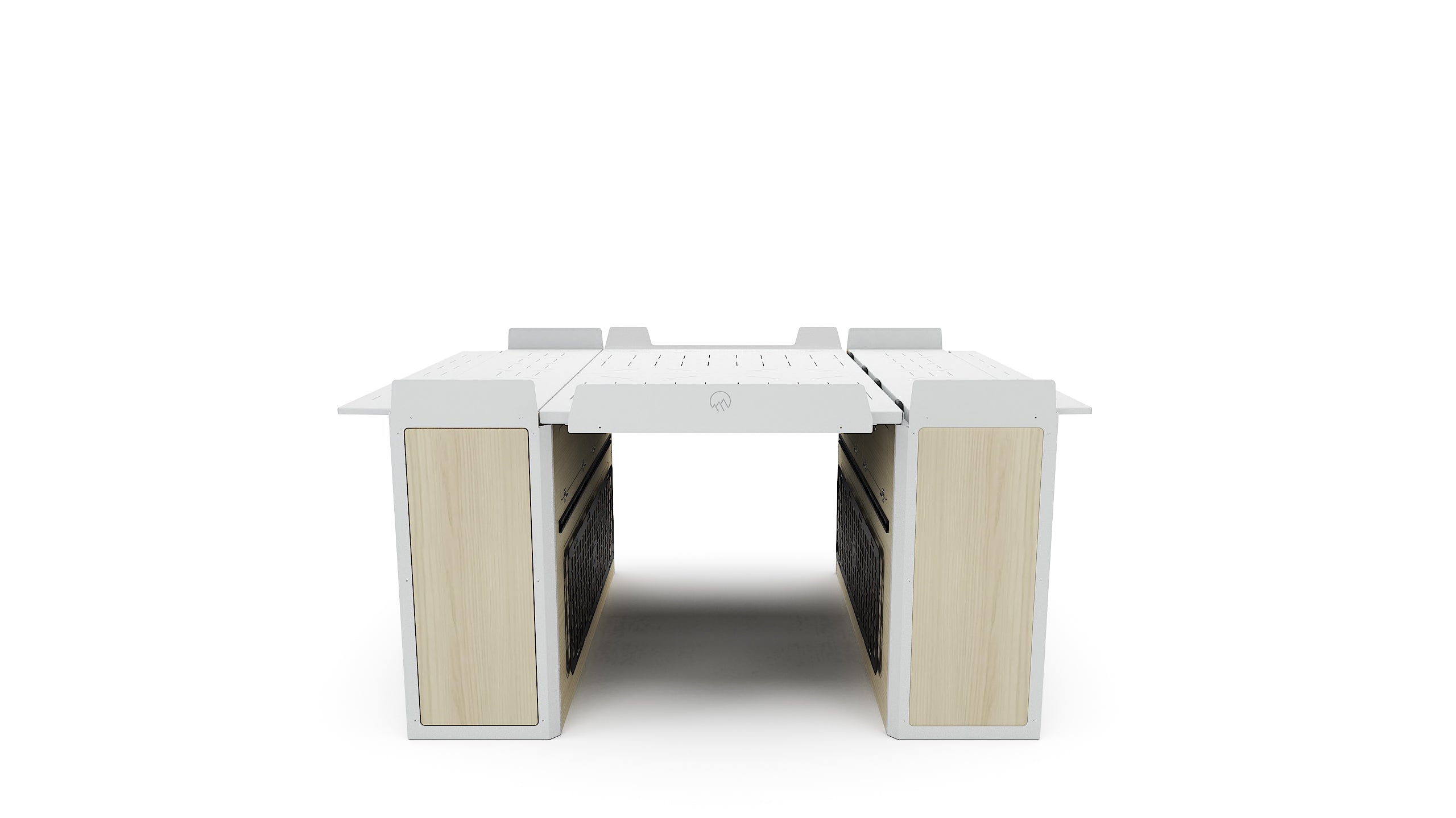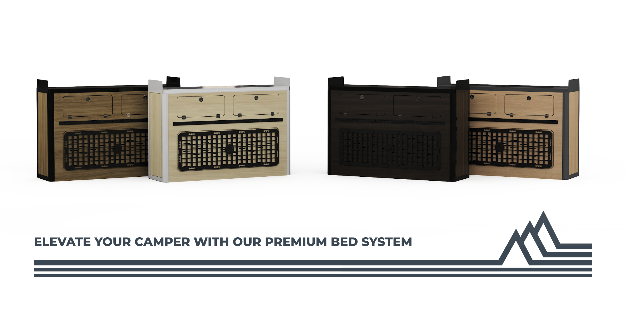 Lift-up bed platform engineered from laser-cut aluminum, providing a full-width storage zone for bikes, gear, and adventure equipment. Stows upright to free floor space and create a versatile workspace. Integrated L-tracks and MOLLE panel systems.